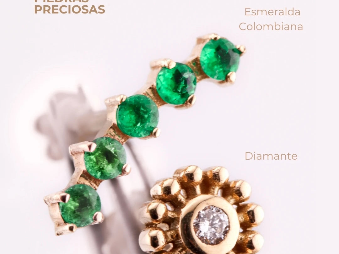 • Oro 18K con diamantes y esmeraldas: lujo duradero y hipoalergénico.