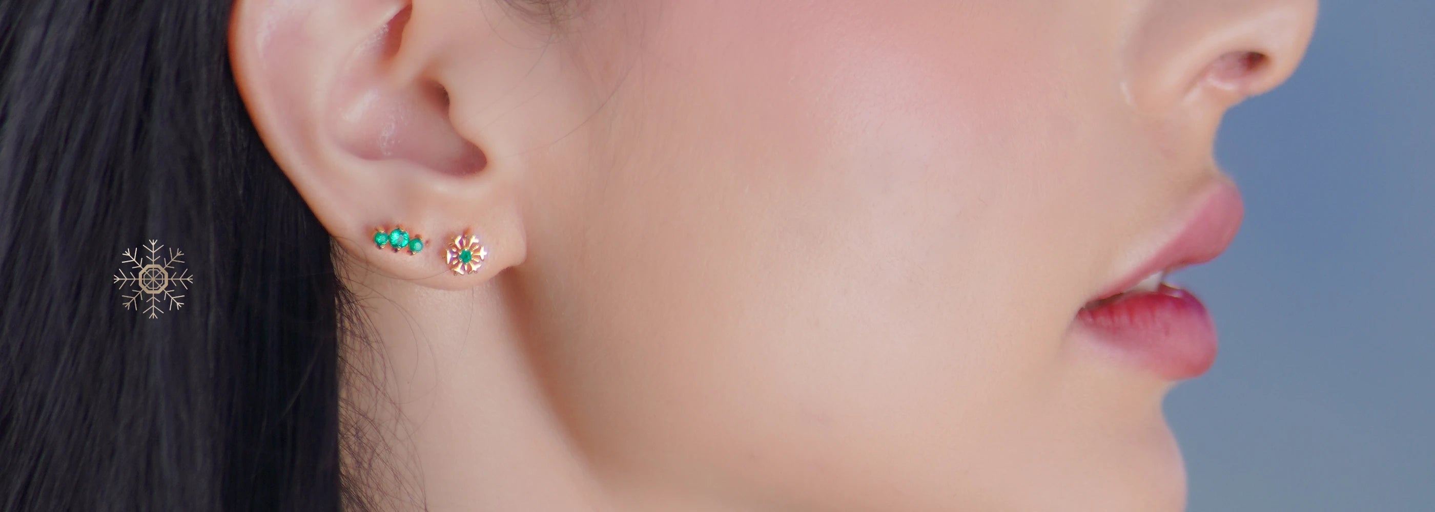 Cada joya de la colección Aurora está diseñada para realzar tus piercings de oreja con un brillo delicado pero contundente. Las esmeraldas aportan un tono verde profundo que simboliza esperanza y renovación, mientras que los diamantes añaden destellos sutiles que se notan tanto de cerca como a la distancia.