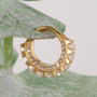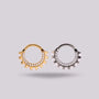 Su diseño es ideal para perforaciones como septum y daith, donde el frente de la joya cobra protagonismo. Disponible en plateado natural y dorado PVD, Radiance es una pieza versátil que eleva cualquier look con un acabado limpio y editorial.