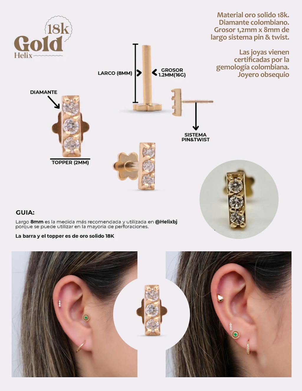 Fabricadas con oro de 18 kilates y fina incrustación de diamante color G / Pureza VS, estas joyas no solo destacan por su diseño único, sino por su durabilidad. Desde tiempos inmemoriales, el oro ha sido elogiado por su belleza eterna y su durabilidad incomparable en el mundo de la joyería. Los piercings en oro sólido 18K, son una expresión de lujo y distinción que redefine el arte de la modificación corporal.